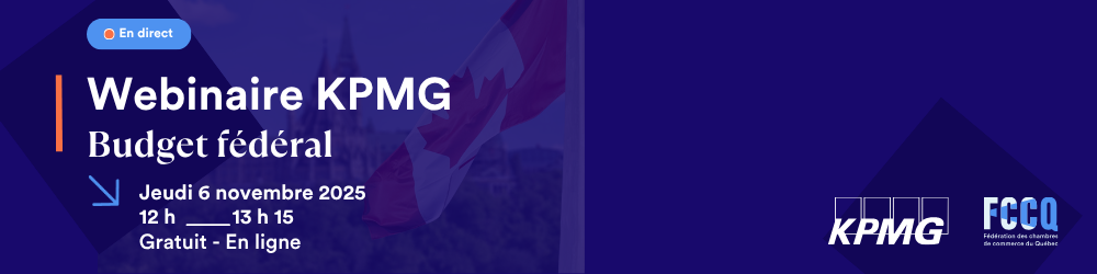 La Fédération des chambres de commerce du Québec (FCCQ), en collaboration avec KPMG, vous convie à un webinaire exclusif et gratuit portant sur le Budget fédéral 2025-2026.