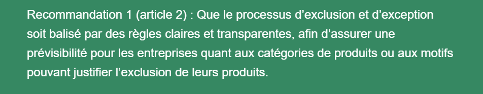 La FCCQ demande au gouvernement du Québec de veiller à ce que les mécanismes d’exclusion et d’exception ne deviennent pas une norme, qui donnerait comme résultat, d’aller à l’encontre des objectifs visés par le projet de loi. En ce sens, les entreprises souhaiteraient avoir des précisions le plus rapidement possible, sur les produits ou catégories de produits qui se retrouveraient dans les projets de règlement, qui découleront de l’adoption du projet de loi 112.