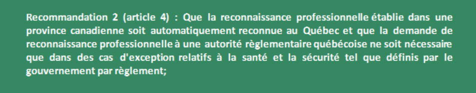 Ainsi, l’obligation de faire valider une reconnaissance professionnelle au Québec devrait se limiter aux seules situations exceptionnelles présentant un risque pour la santé ou la sécurité. Ces situations devraient être définies par règlement gouvernemental, sur la base des recommandations formulées par l’autorité de réglementation compétente.