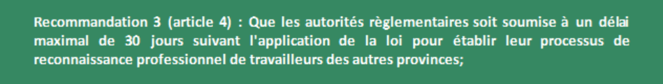 Nous croyons que le projet de loi 112 pourrait être bonifié en limitant au maximum les délais imposés à un travailleur souhaitant exercer au Québec. Dans le cas des métiers et professions qui ne sont pas soumis au Code des professions, le gouvernement mandate les autorités de règlementation québécoises à délivrer le certificat de reconnaissance professionnelle selon un processus interne à établir.