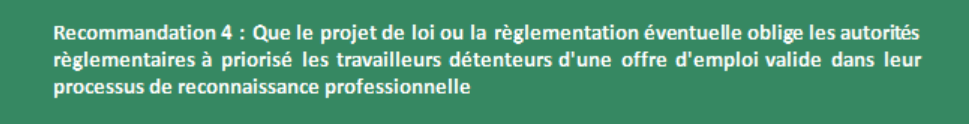 Pour ce faire, nous recommandons d’inclure dans la loi ou dans les règlements établissant les exceptions, l’obligation pour les autorités de règlementation de traiter les demandes de reconnaissance en priorité pour les travailleurs déjà embauchés.