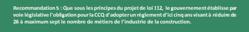 Considérant que la Commission de la construction du Québec a déjà eu des réflexions sérieuses sur la réduction du nombre de métier, nous proposons de leur octroyer de façon législative le mandat d’adopter un règlement faisant passer le nombre de métiers à un nombre entre cinq et sept d’ici les cinq prochaines années. Une telle obligation a d’ailleurs été utilisé afin d’imposer à la Commission des normes, de l’équité, de la santé et de la sécurité du travail (CNESST) l’adoption d’un règlement en regard aux mécanismes de prévention et de participation des travailleurs dans un délai de deux ans. Nous avions d’ailleurs fait cette proposition lors des consultations sur le projet de loi 51.